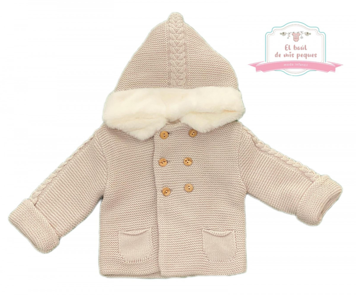 Original abrigo de lana, con gorro y con detalle pelito en el cuello, todo de lana.