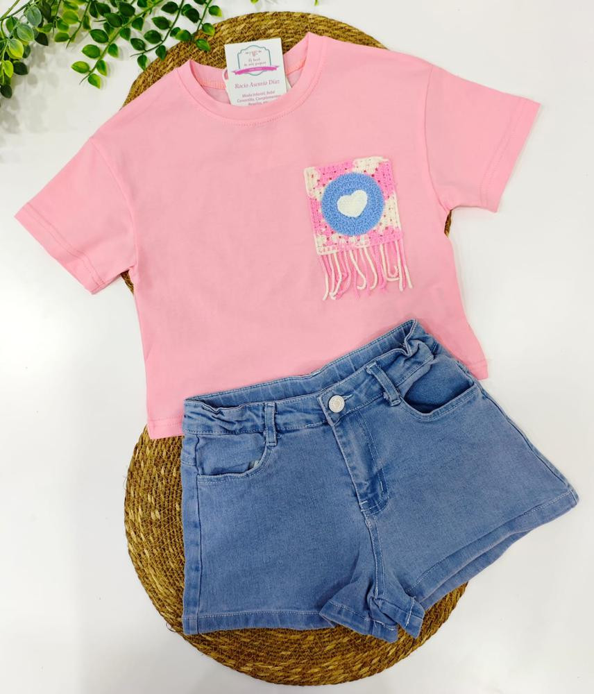Conj.vaquero y camiseta algodón rosa con bolsillo Crochet