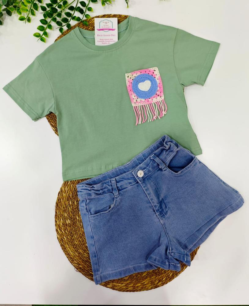 Conj.vaquero y camiseta algodón verde con bolsillo Crochet