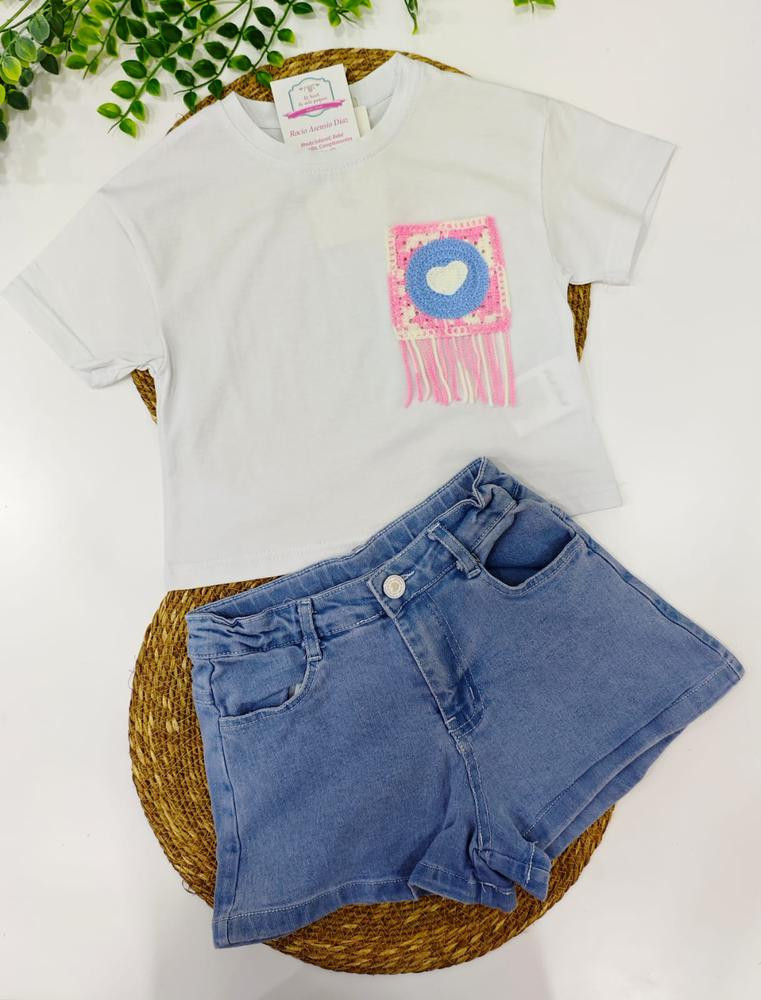 Conj.vaquero y camiseta algodón blanca con bolsillo Crochet