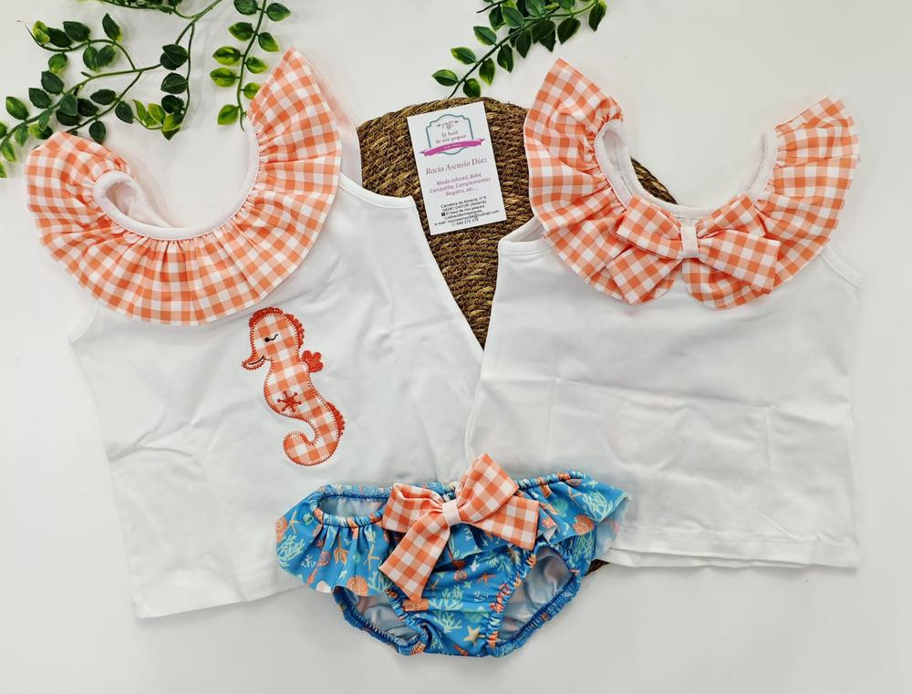 conjunto baño cabalito de mar vichy naranja niña