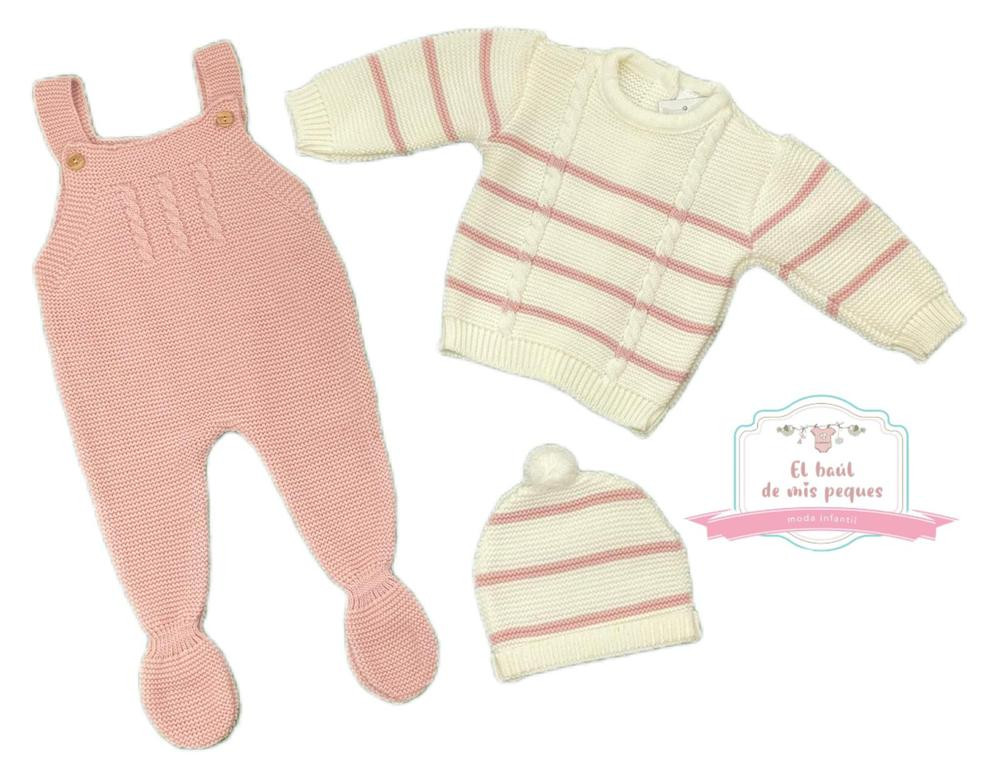 Conjunto peto + jersey gorrito pompón Rosa y crudo