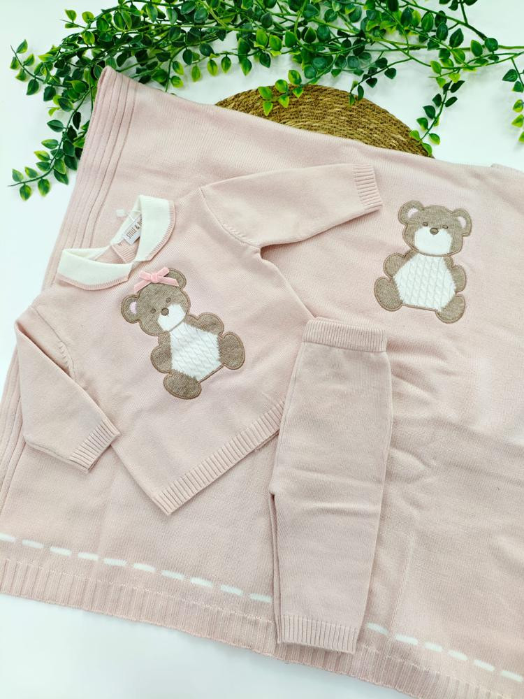 Conjunto punto 2 piezas lana osito con mantita a juego rosa empolvado