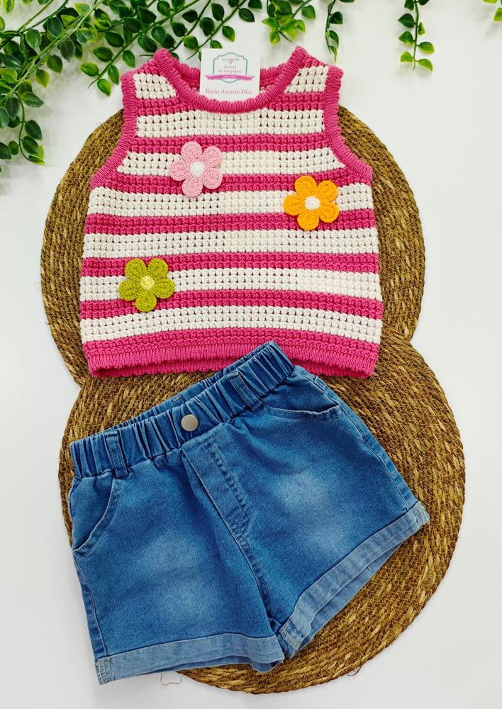 Precioso Conjunto de Short de crochet de rallas blanco y rosa con flores decorativas también de crochet y pantalón vaquero.