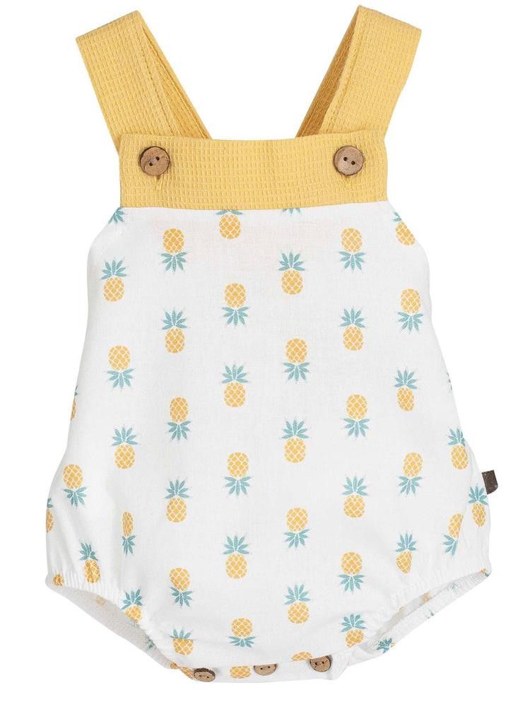 Original peto de tirantes de bebe niño de la nueva colección de ropa Calamaro para esta primavera verano 2026, modelo 32544 de la familia Gaya confeccionado en algodón estampado con piñas. FABRICADO EN ESPAÑA