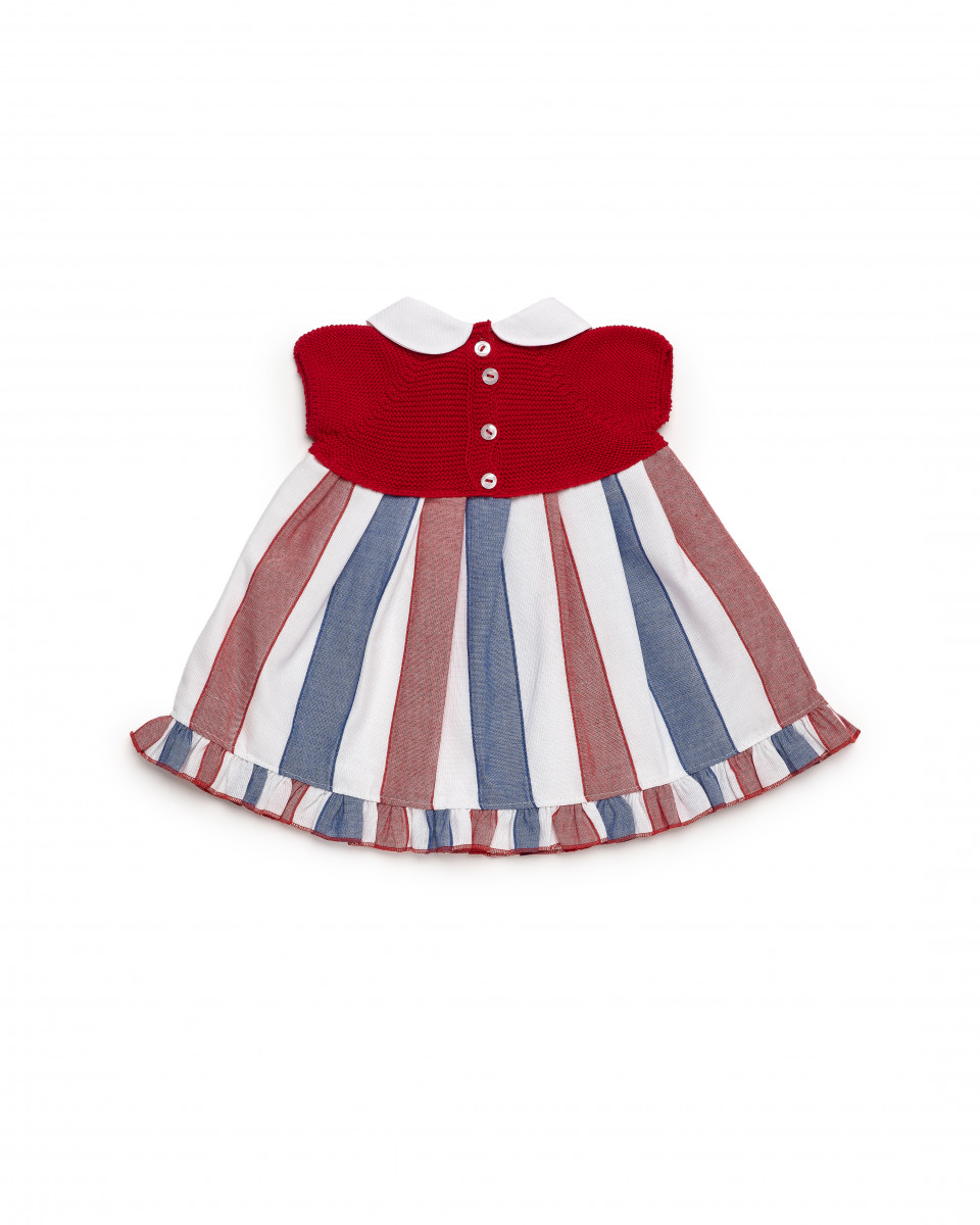 vestido para niña de manga corta de la marca Juliana. Confeccionado con el cuerpo de punto de color rojo con la manga renglán y falda de tela estampada de rayas verticales rojo, azul y blanco. Luce cuello de solapas de color blanco y volante en el bajo. Cierra en la espalda con botonadura vista.